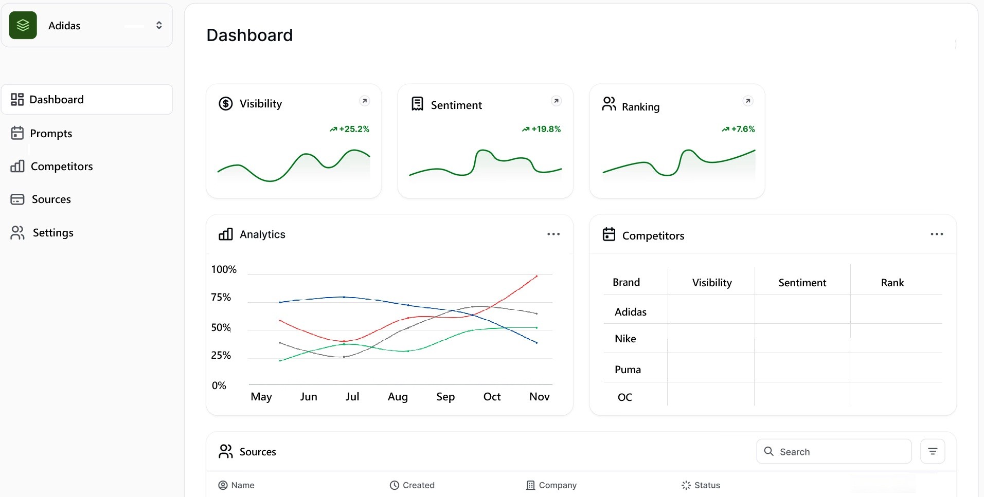 Create your workspace by adding your brand name and domain. Next, write a few sample prompts that mirror real customer queries. Within a day, your dashboard will begin showing visibility and performance insights.